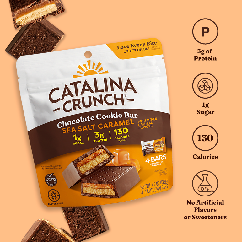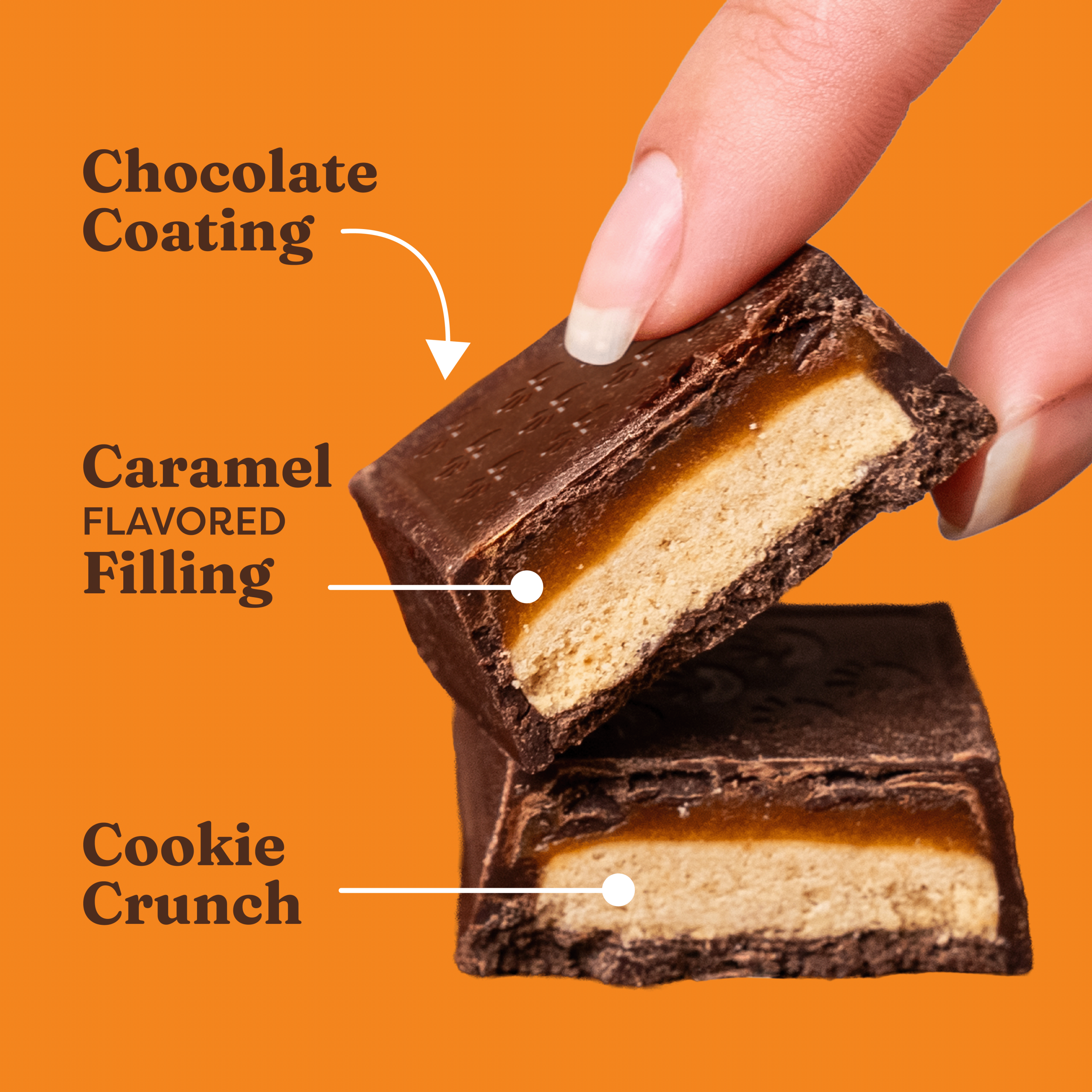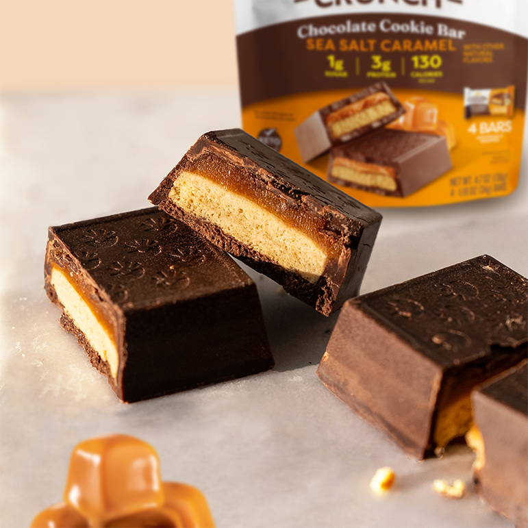 Indulge in a rich blend of velvety chocolate. crunchy cookie. and golden caramel filling with a hint of sea salt.